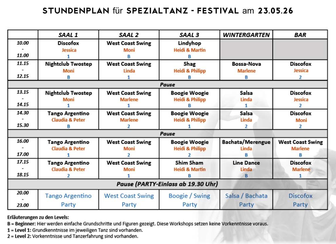 Tanz-Unterricht: Sie können aus insgesamt über 25 Spezialtanz-Workshops (je 60 Min.) innerhalb der jeweiligen Ticket-Kategorie (LARGE, MEDIUM, SMALL) auswählen. Tanzparty: 5 Tanzpartys gleichzeitig von 20-23 Uhr. Gema-Gebühren und gesetzliche Mehrwertsteuer.
